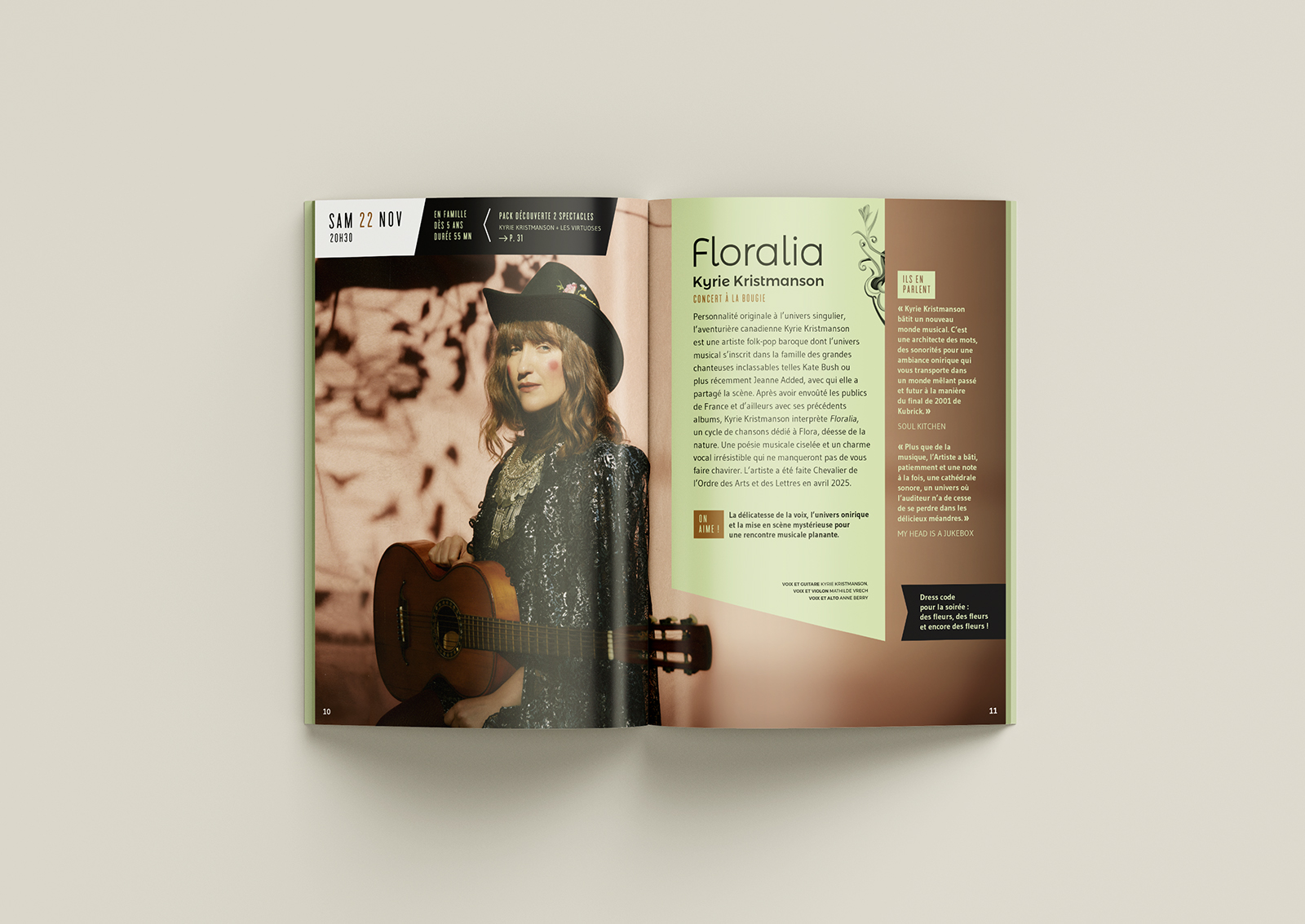 Tout autour, la nature affleure : feuillages, oiseaux, dorures, lumière solaire et lumière intérieure. Cet univers végétal et rayonnant fait écho à Floralia, le nouvel album de Kyrie Kristmanson. Entre musique ancienne, poésie et onirisme, son œuvre ranime les liens profonds entre la voix et les cycles du vivant, comme une véritable ode à la nature.